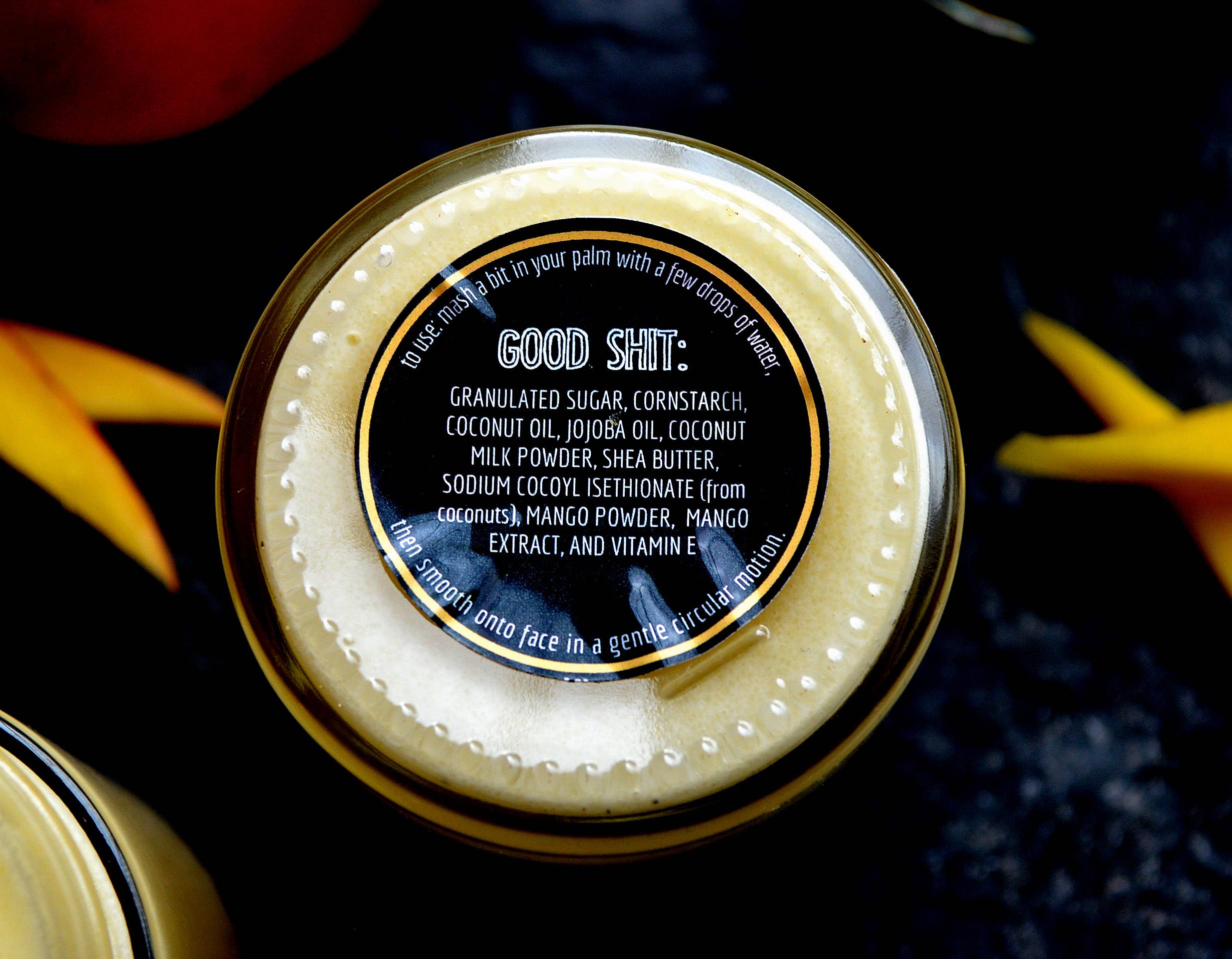 Ingredients: This natural face scrub is made with granulated sugar, cornstarch, coconut oil, jojoba oil, coconut milk powder, shea butter, sodium cocoyl isethionate, mango powder, and mango extract. Handmade from natural ingredients in Upstate New York.